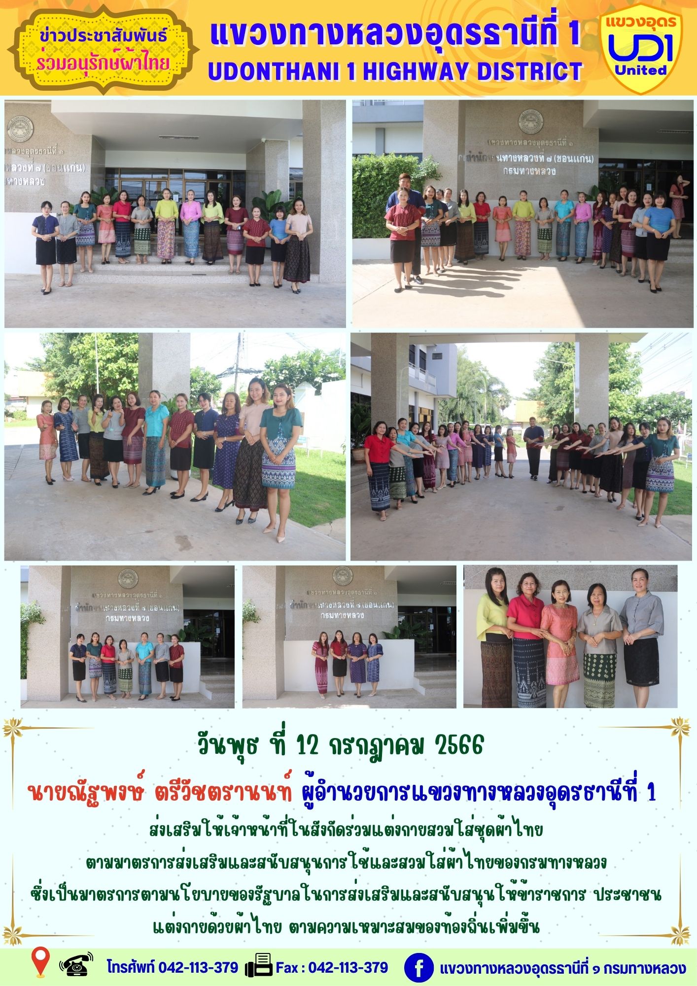 นายณัฐพงษ์ ตรีวัชตรานนท์ ผู้อำนวยการแขวงทางหลวงอุดรธานีที่ 1 พร้อมด้วยนายสมเด็จ ปุระเทพ รอ.ขท.อุดรธานีที่ 1 (ป) , นางพานิช สาระมาศ รอ.ขท.อุดรธานีที่ 1 (บ) และเจ้าหน้าที่ในสังกัดร่วมแต่งกายสวมใส่ชุดผ้าไทย ตามมาตรการส่งเสริมและสนับสนุนการใช้ และสวมใส่ผ้าไทย ของกรมทางหลวง ซึ่งเป็นมาตรการตามนโยบายของรัฐบาลในการส่งเสริม และสนับสนุนให้ข้าราชการ ประชาชนแต่งกายด้วยผ้าไทย ตามความเหมาะสมของท้องถิ่นเพิ่มขึ้น