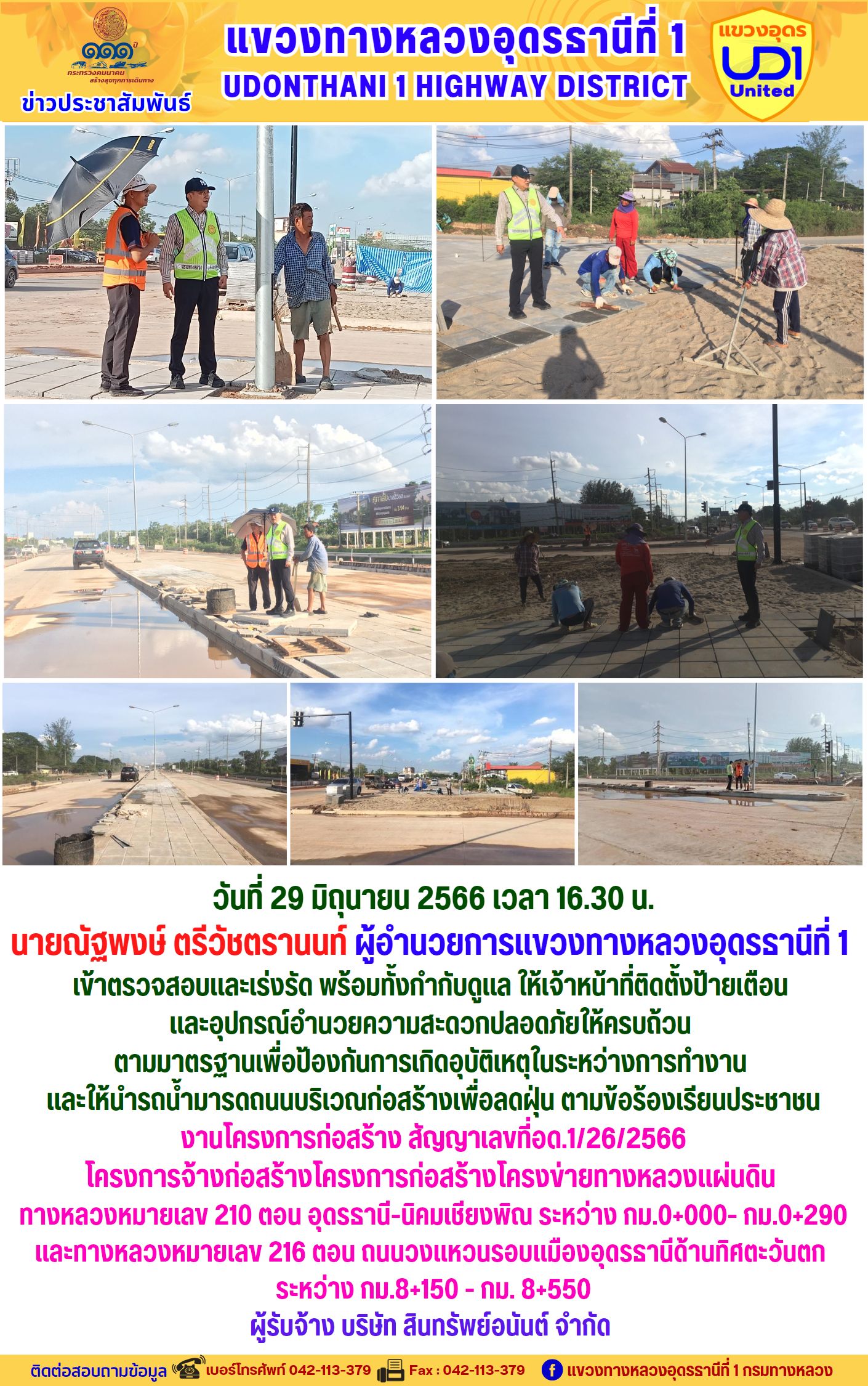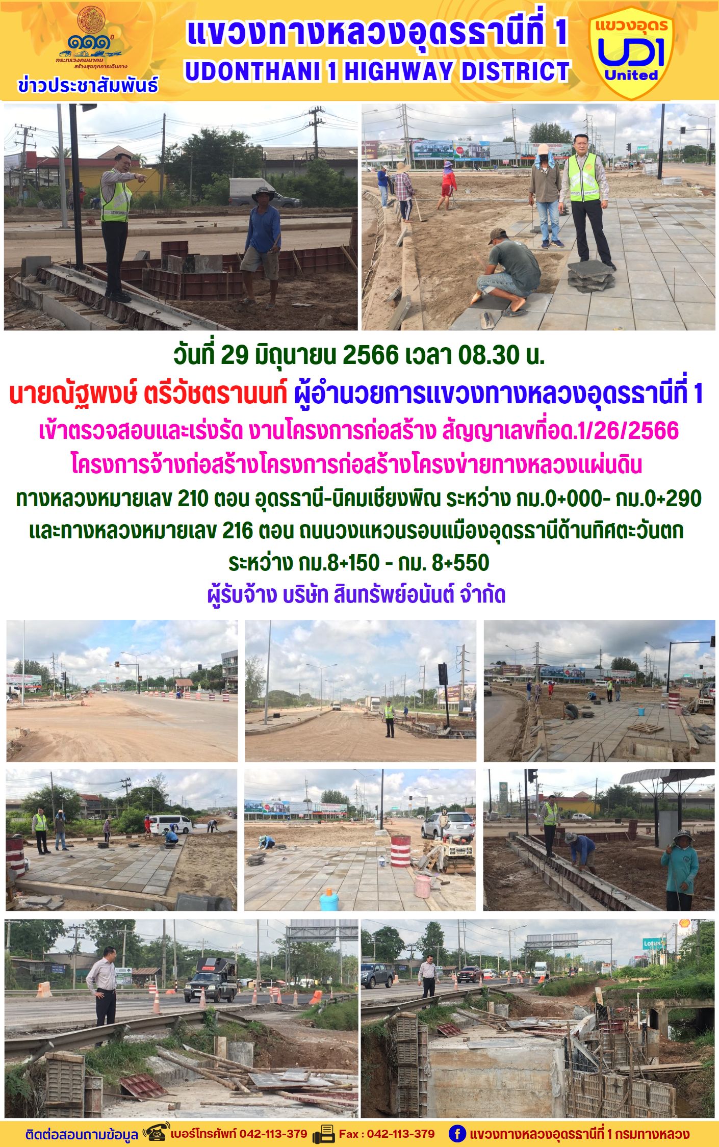 นายณัฐพงษ์ ตรีวัชตรานนท์ ผู้อำนวยการแขวงทางหลวงอุดรธานีที่ 1 เข้าตรวจสอบและเร่งรัด งานโครงการก่อสร้าง สัญญาเลขที่อด.1/26/2566 โครงการจ้างก่อสร้างโครงการก่อสร้างโครงข่ายทางหลวงแผ่นดิน ทางหลวงหมายเลข 210 ตอน อุดรธานี-นิคมเชียงพิณ ระหว่าง กม.0+000- กม.0+290 และทางหลวงหมายเลข 216 ตอน ถนนวงแหวนรอบแมืองอุดรธานีด้านทิศตะวันตก ระหว่าง กม.8+150 - กม. 8+550
