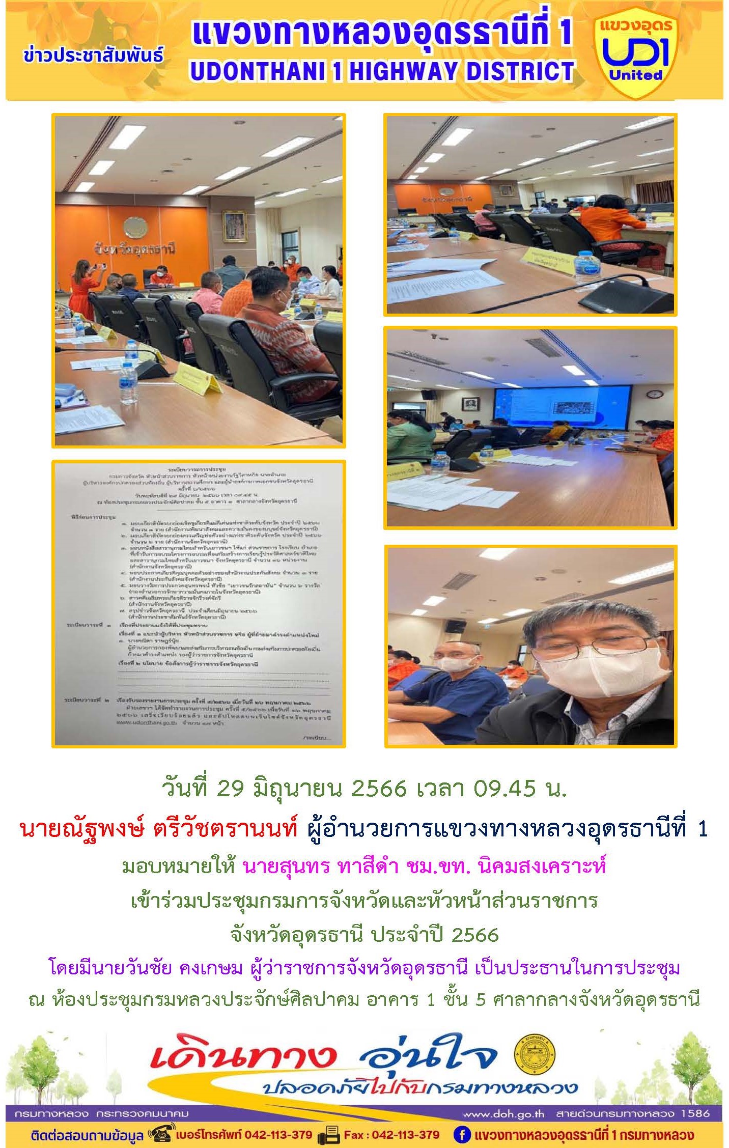 นายณัฐพงษ์ ตรีวัชตรานนท์ ผู้อำนวยการแขวงทางหลวงอุดรธานีที่ 1 มอบหมายให้ นายศุภชัย ศรีโยธี รอ.ขท.อุดรธานีที่ 1 (ว) เข้าร่วมประชุมคณะทำงานติดตามสถานการณ์และการบริหารจัดการน้ำ (อุทกภัย) ปี 2566) ครั้งที่ 3/2566 ณ ห้องประชุมพระยาศรีสุริยราชวราวัตร (โพธิ์ เนติโพธิ์) อาคาร 1 ชั้น 3 ศาลากลางจังหวัดอุดรธานี