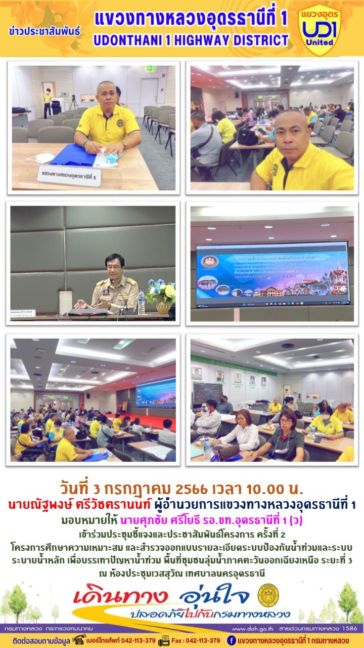 นายณัฐพงษ์ ตรีวัชตรานนท์ ผู้อำนวยการแขวงทางหลวงอุดรธานีที่ 1 มอบหมายให้ นายศุภชัย ศรีโยธี รอ.ขท.อุดรธานีที่ 1 (ว) เข้าร่วมประชุมชี้แจงและประชาสัมพันธ์โครงการ ครั้งที่ 2 โครงการศึกษาความเหมาะสม และสำรวจออกแบบรายละเอียดระบบป้องกันน้ำท่วมและระบบระบายน้ำหลัก เพื่อบรรเทาปัญหาน้ำท่วม พื้นที่ชุมชนลุ่มน้ำภาคตะวันออกเฉียงเหนือ ระยะที่ 3 ณ ห้องประชุมเวสสุวัณ เทศบาลนครอุดรธานี