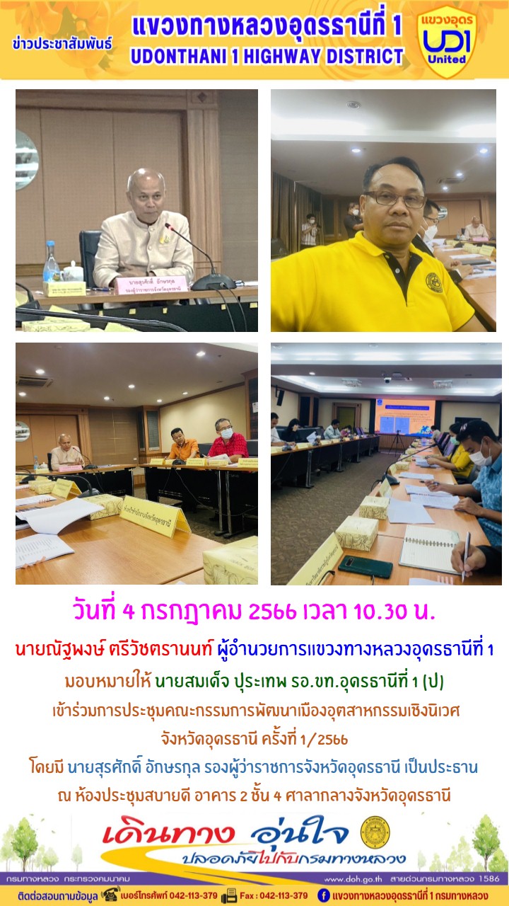 นายณัฐพงษ์ ตรีวัชตรานนท์ ผู้อำนวยการแขวงทางหลวงอุดรธานีที่ 1 มอบหมายให้ นายสมเด็จ ปุระเทพ รอ.ขท.อุดรธานีที่ 1 (ป) เข้าร่วมการประชุมคณะกรรมการพัฒนาเมืองอุตสาหกรรมเชิงนิเวศ จังหวัดอุดรธานี ครั้งที่ 1/2566 โดยมี นายสุรศักดิ์ อักษรกุล รองผู้ว่าราชการจังหวัดอุดรธานี เป็นประธาน ณ ห้องประชุมสบายดี อาคาร 2 ชั้น 4 ศาลากลางจังหวัดอุดรธานี