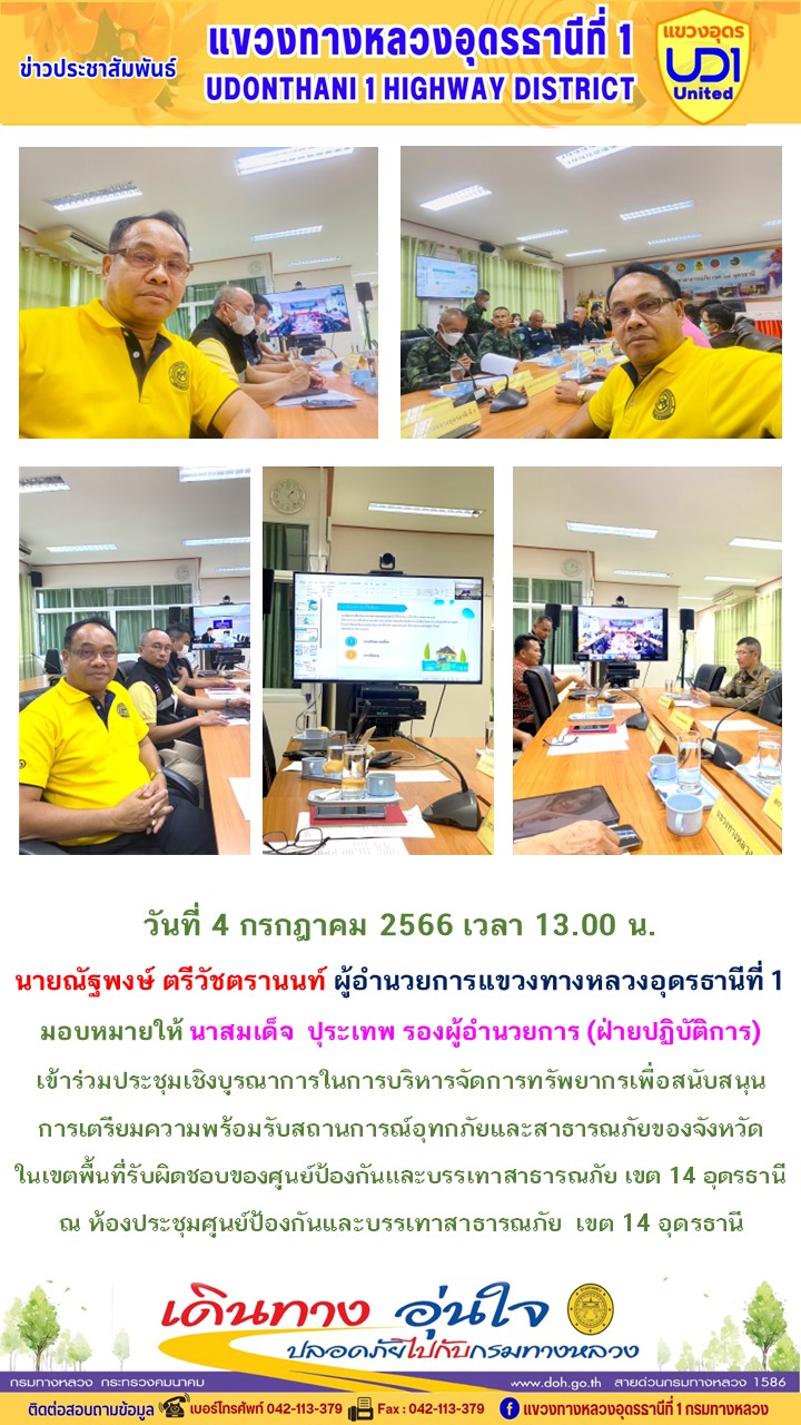 นายณัฐพงษ์ ตรีวัชตรานนท์ ผู้อำนวยการแขวงทางหลวงอุดรธานีที่ 1 มอบหมายให้ นายสมเด็จ ปุระเทพ รอ.ขท.อุดรธานีที่ 1 (ป) เข้าร่วมประชุมเชิงบูรณาการในการบริหารจัดการทรัพยากรเพื่อสนับสนุนการเตรียมความพร้อมรับสถานการณ์อุทกภัยและสาธารณภัยของจังหวัดในเขตพื้นที่รับผิดชอบของศูนย์ป้องกันและบรรเทาสาธารณภัย เขต 14 อุดรธานี ณ ห้องประชุมศูนย์ป้องกันและบรรเทาสาธารณภัย เขต 14 อุดรธานี