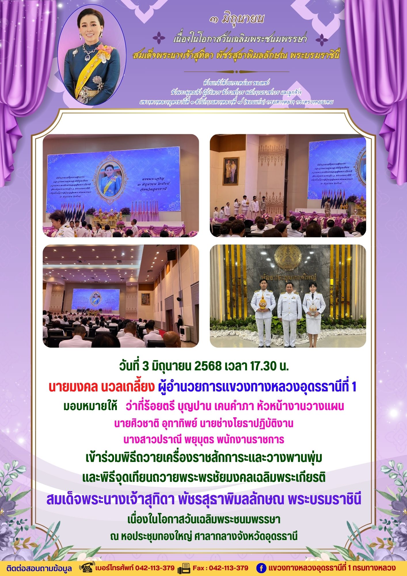 เข้าร่วมพิธีถวายเครื่องราชสักการะและวางพานพุ่ม และพิธีจุดเทียนถวายพระพรชัยมงคลเฉลิมพระเกียรติ สมเด็จพระนางเจ้าสุทิดา พัชรสุธาพิมลลักษณ พระบรมราชินี เนื่องในโอกาสวันเฉลิมพระชนมพรรษา 4-6-68