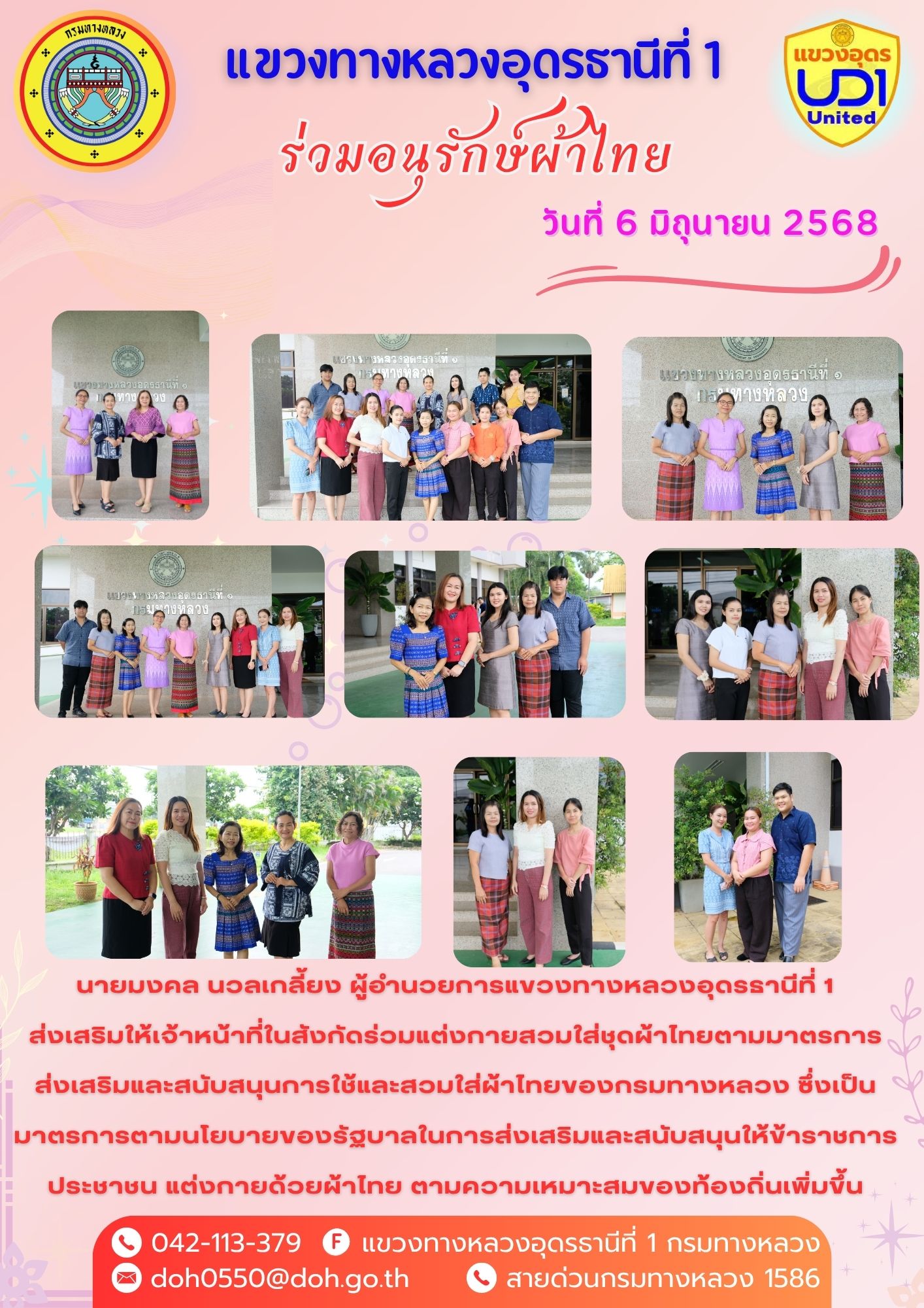 นายมงคล นวลเกลี้ยง ผู้อำนวยการแขวงทางหลวงอุดรธานีที่ 1 ส่งเสริมให้เจ้าหน้าที่ในสังกัดร่วมแต่งกายสวมใส่ชุดผ้าไทยตามมาตรการ ส่งเสริมและสนับสนุนการใช้และสวมใส่ผ้าไทยของกรมทางหลวง ซึ่งเป็นมาตรการตามนโยบายของรัฐบาลในการส่งเสริมและสนับสนุนให้ข้าราชการ ประชาชน แต่งกายด้วยผ้าไทย ตามความเหมาะสมของท้องถิ่นเพิ่มขึ้น