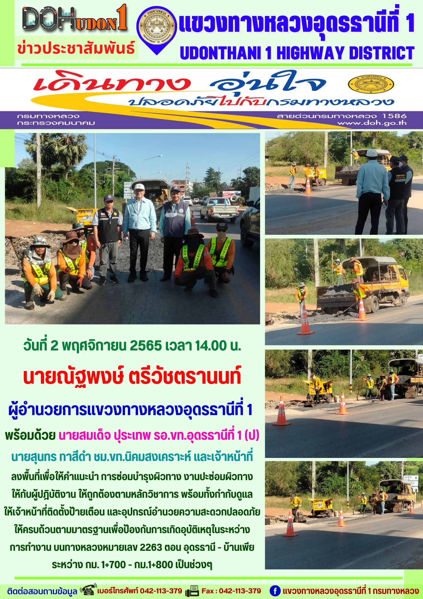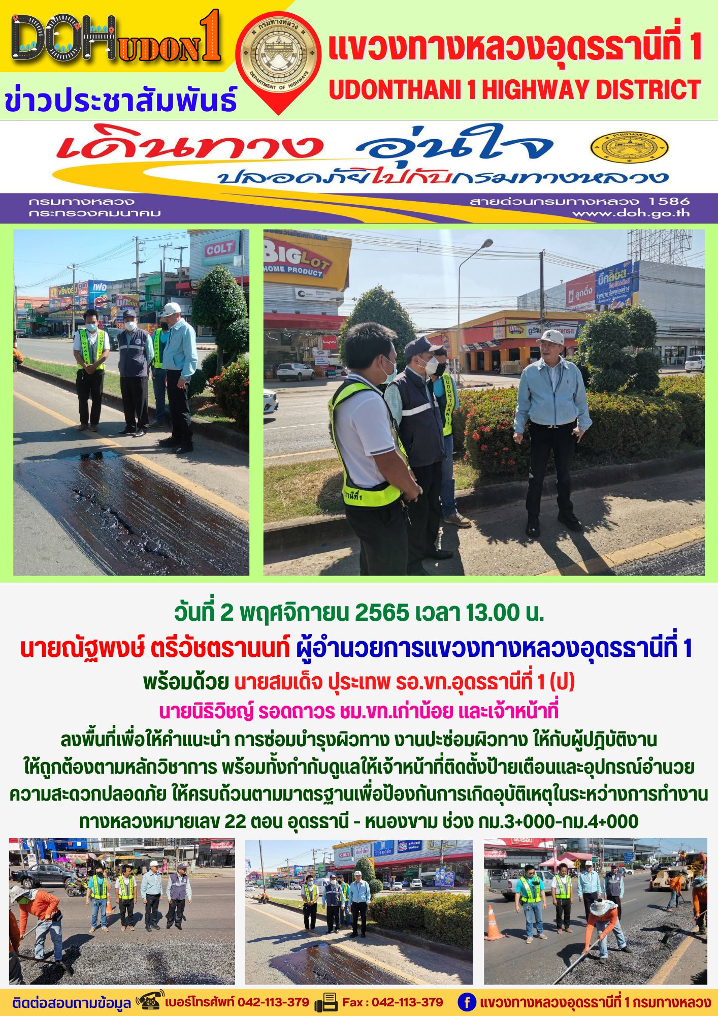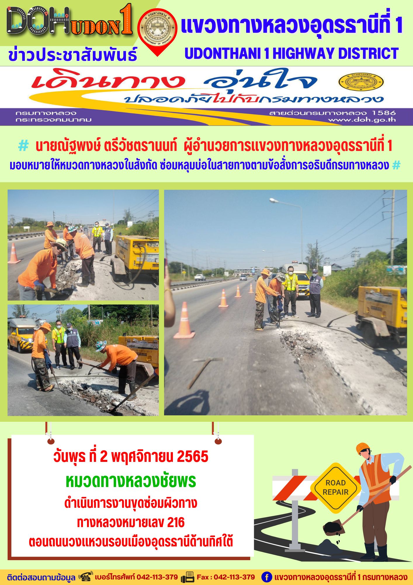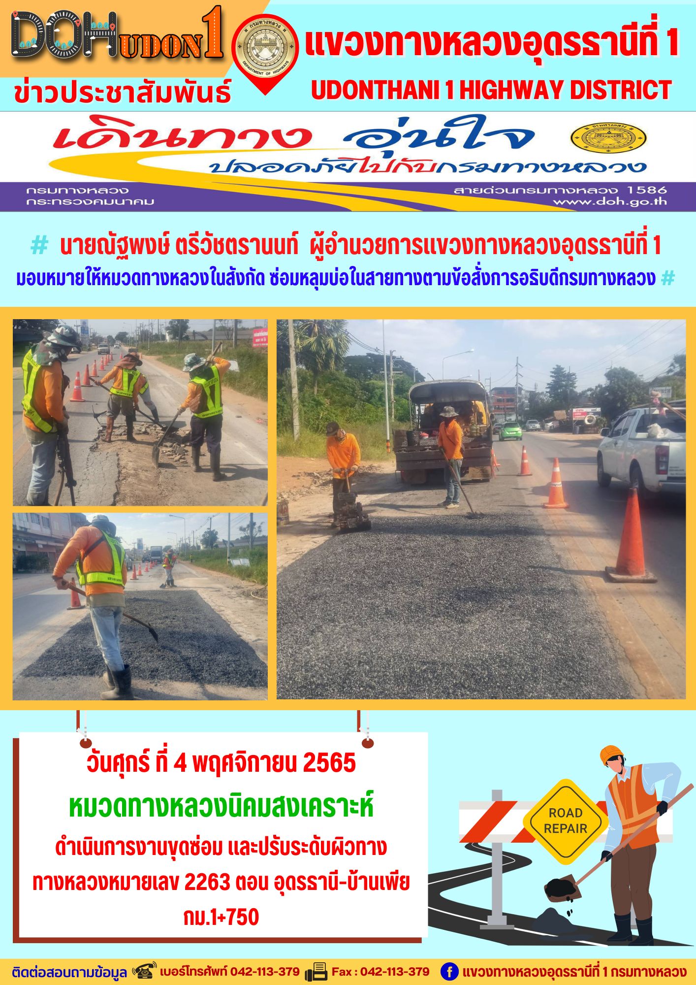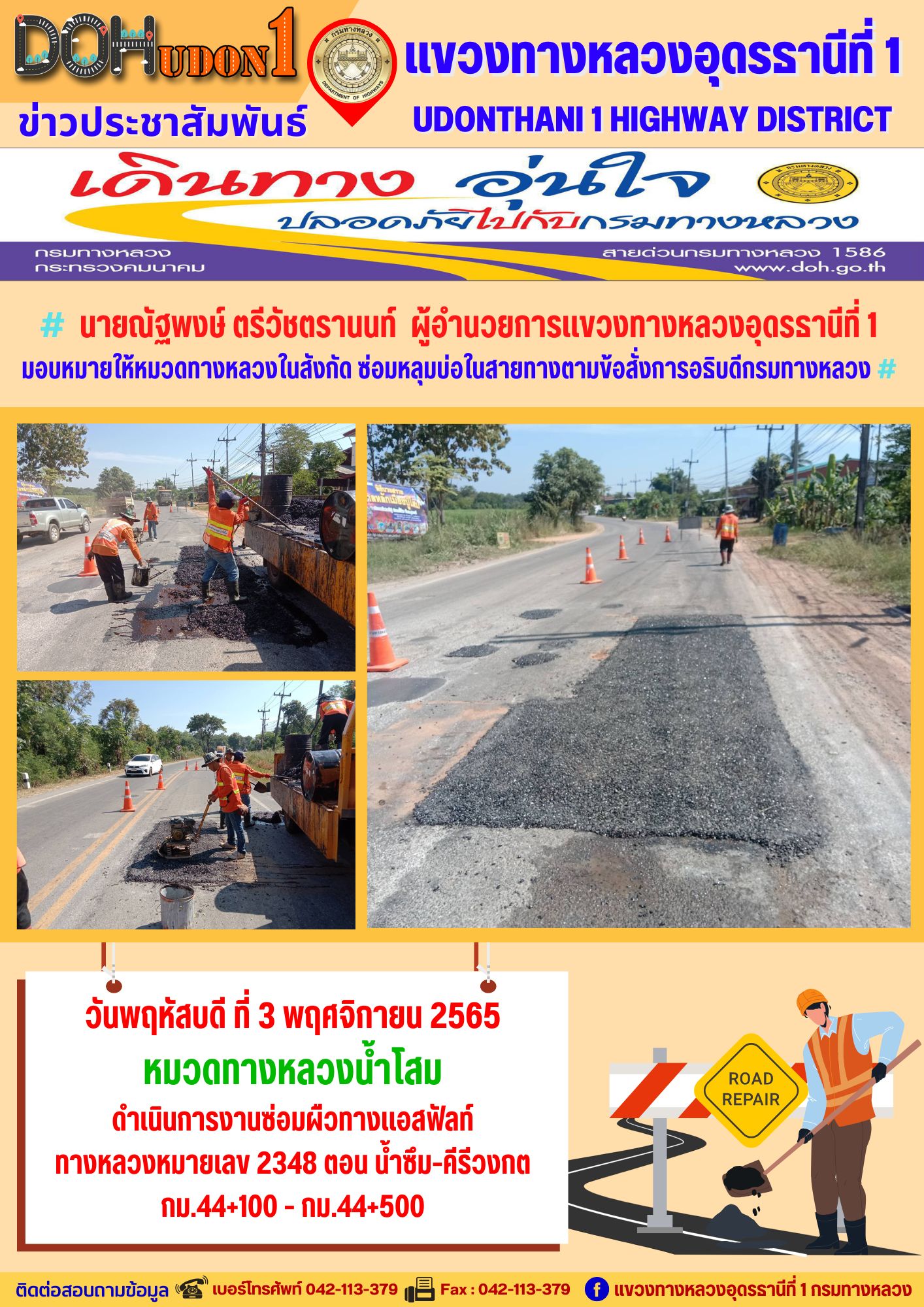 นายณัฐพงษ์ ตรีวัชตรานนท์ ผู้อำนวยการแขวงทางหลวงอุดรธานีที่ 1 มอบหมายให้ นายสมเด็จ ปุระเทพ รอ.ขท.อุดรธานีที่ 1 (ป) ลงพื้นที่เพื่อให้คำแนะนำ การซ่อมบำรุงผิวทาง งานปะซ่อมผิวทาง ให้กับผู้ปฎิบัติงาน