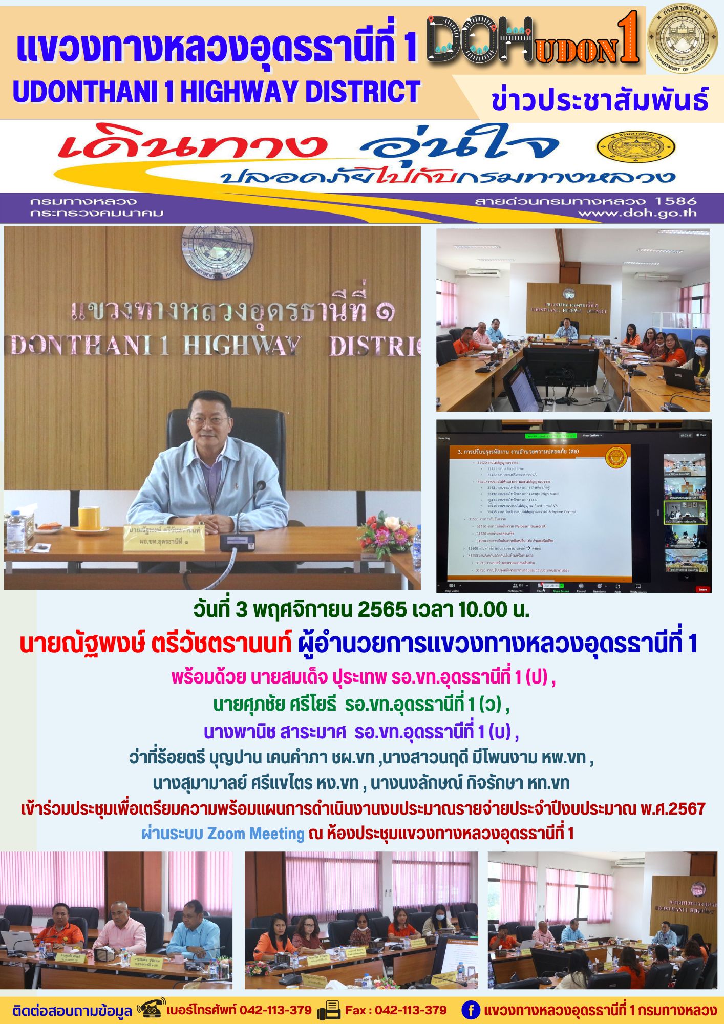 นายณัฐพงษ์ ตรีวัชตรานนท์ ผู้อำนวยการแขวงทางหลวงอุดรธานีที่ 1 มอบหมายให้ นายณรงค์ชัย ตำตาด ผู้ช่วยหมวดทางหลวงเก่าน้อย เข้าร่วมประชุมคณะกรรมการรักษาความสงบเรียบร้อยจังหวัดอุดรธานี ครั้งที่ 8/2565