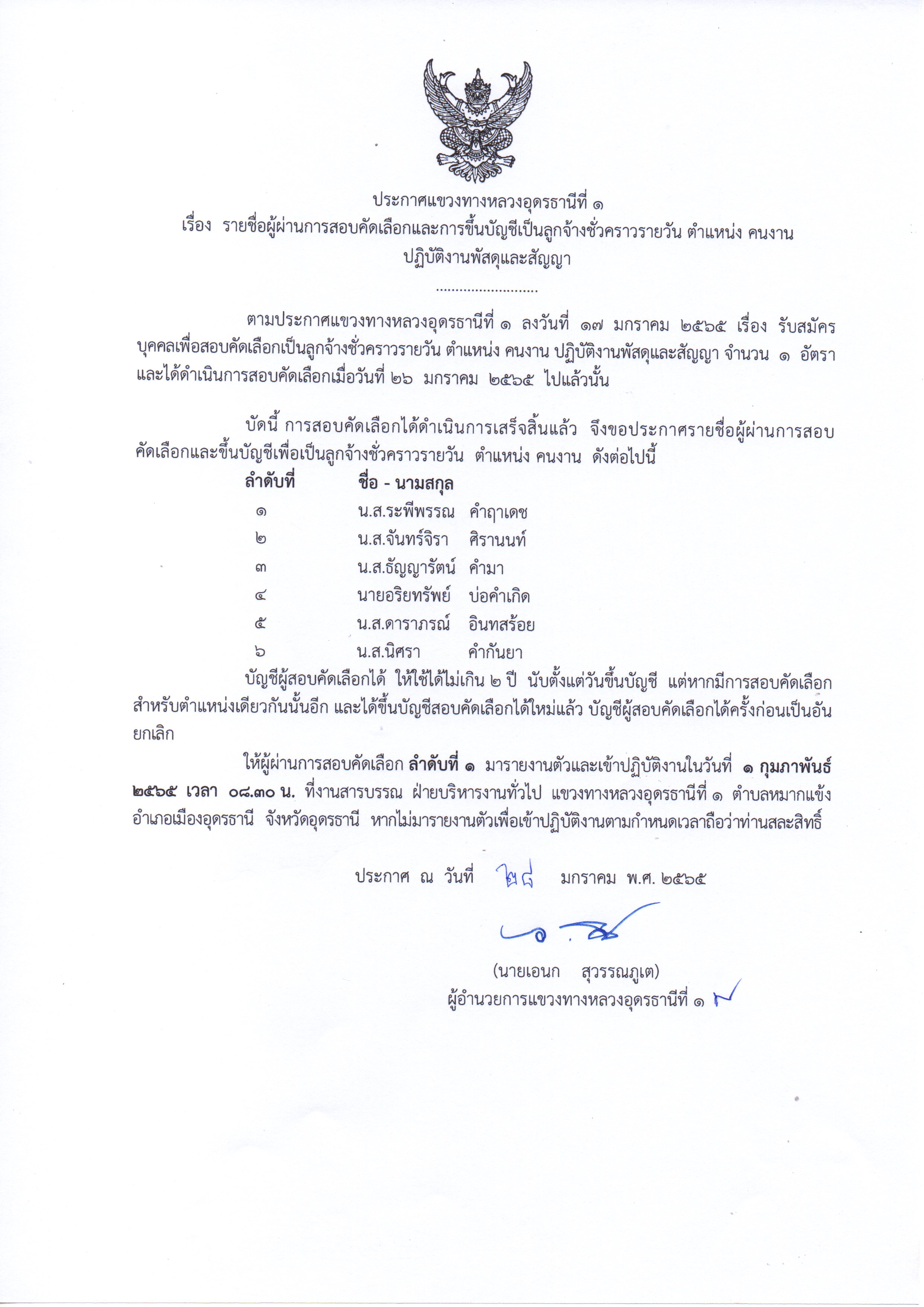 ประกาศรายชื่อผู้ผ่านการสอบคัดเลือกและขึ้นบัญชีเพื่อเป็น ลูกจ้างชั่วคราว ตำแหน่ง คนงาน เพื่อปฏิบัติงานพัสดุและสัญญา