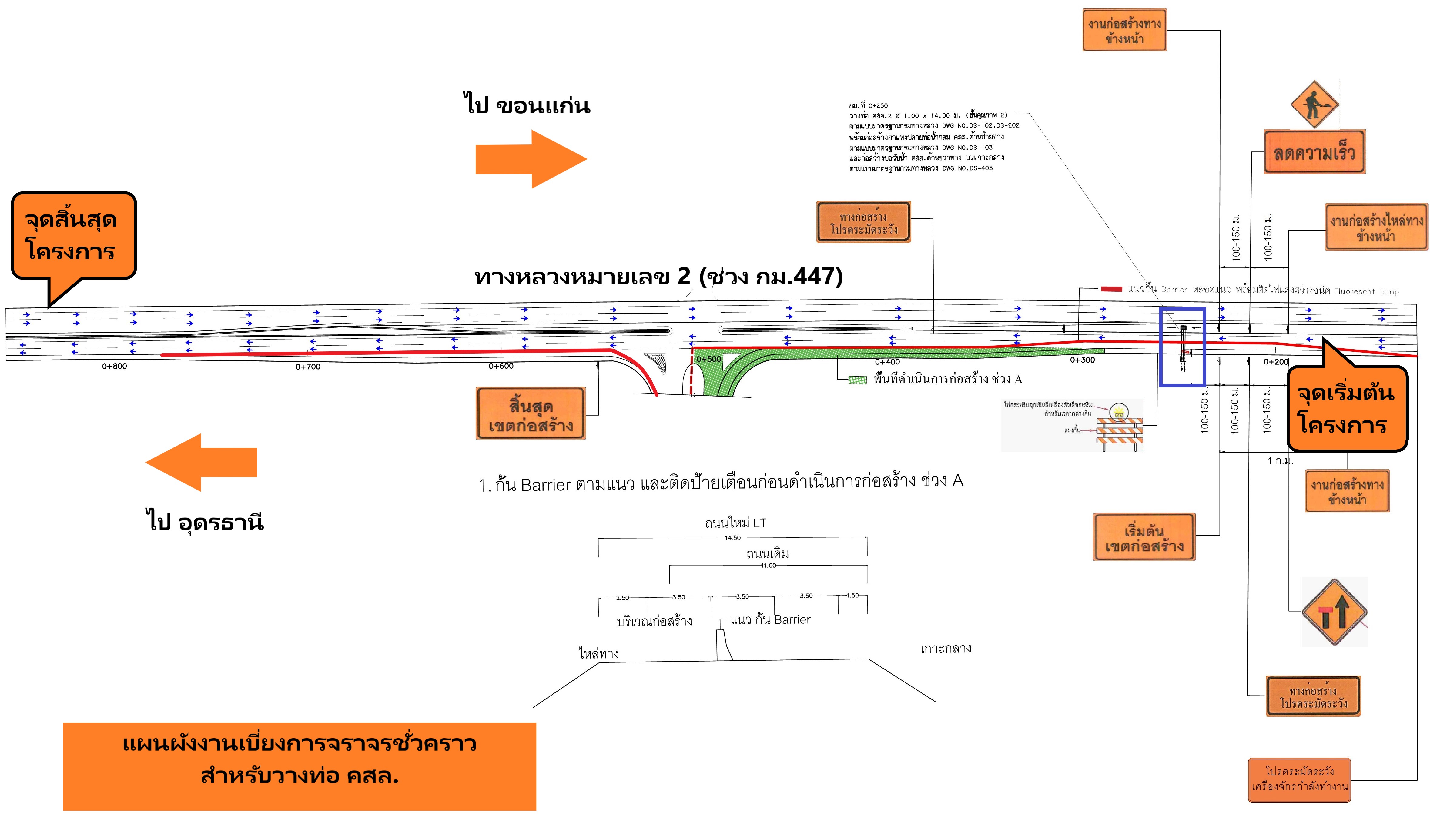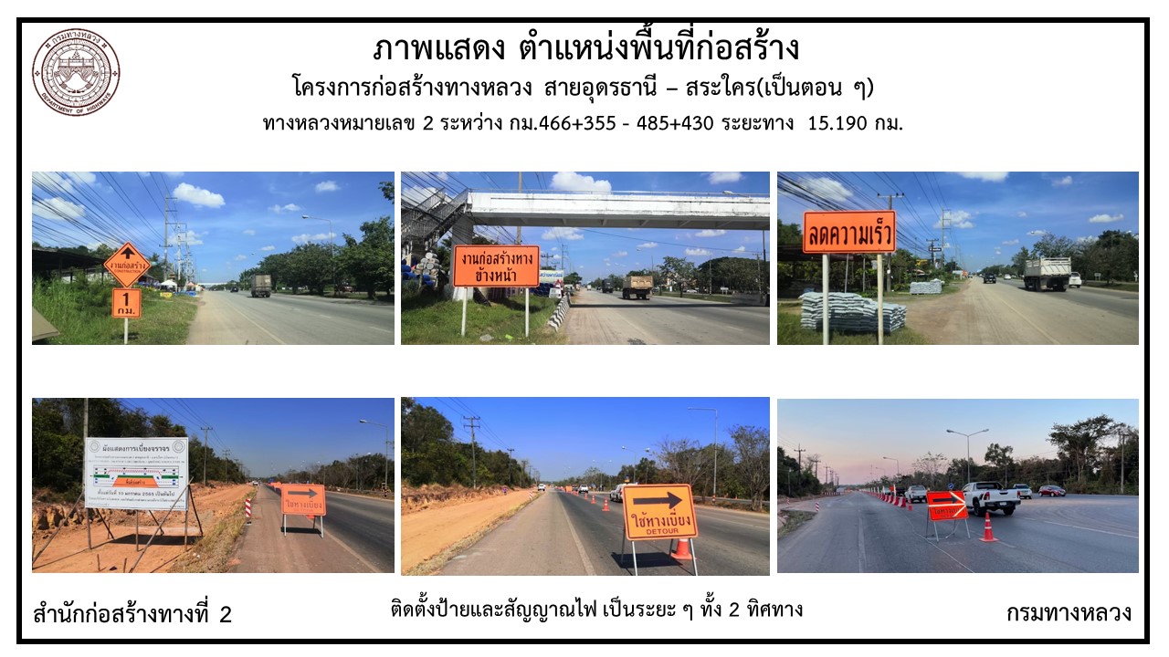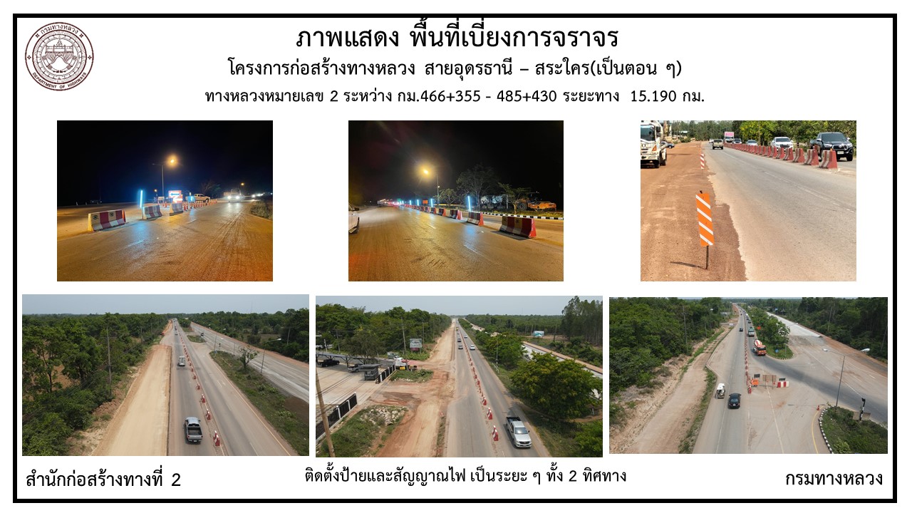 โครงการก่อสร้างทางหลวงหมายเลข 2 สายอุดรธานี – อำเภอสระใคร จะทำการเบี่ยงการจราจรและปิดจุดกลับรถ เพื่อการก่อสร้าง CONCRETE PAVEMENT บนคันทางเดิมรวมทั้งส่วนขยาย