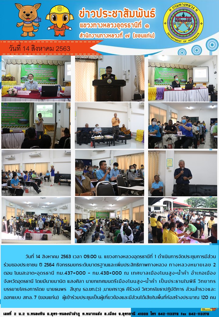 748 14/08/2563 ประชุมการมีส่วนร่วมของประชาชน ปี 2564 กิจกรรมยกระดับมาตรฐานและเพิ่มประสิทธิภาพทางหลวง ทางหลวงหมายเลข 2 ตอน โนนสะอาด-อุดรธานี กม.437+000 - กม.438+000