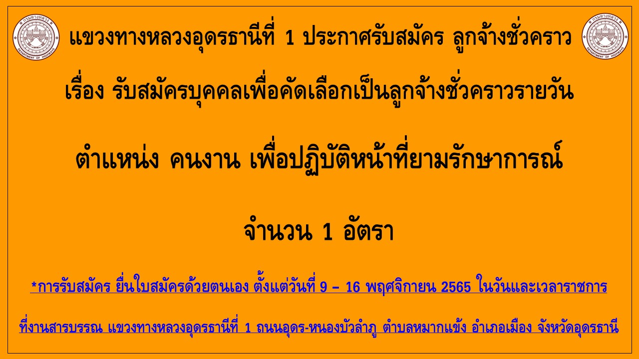 ประกาศแขวงทางหลวงอุดรธานีที่ 1 เรื่อง รับสมัครบุคคลเพื่อสอบคัดเลือกเป็นลูกจ้างชั่วคราวรายวัน ตำแหน่ง คนงาน เพื่อปฏิบัติหน้าที่ยามรักษาการณ์