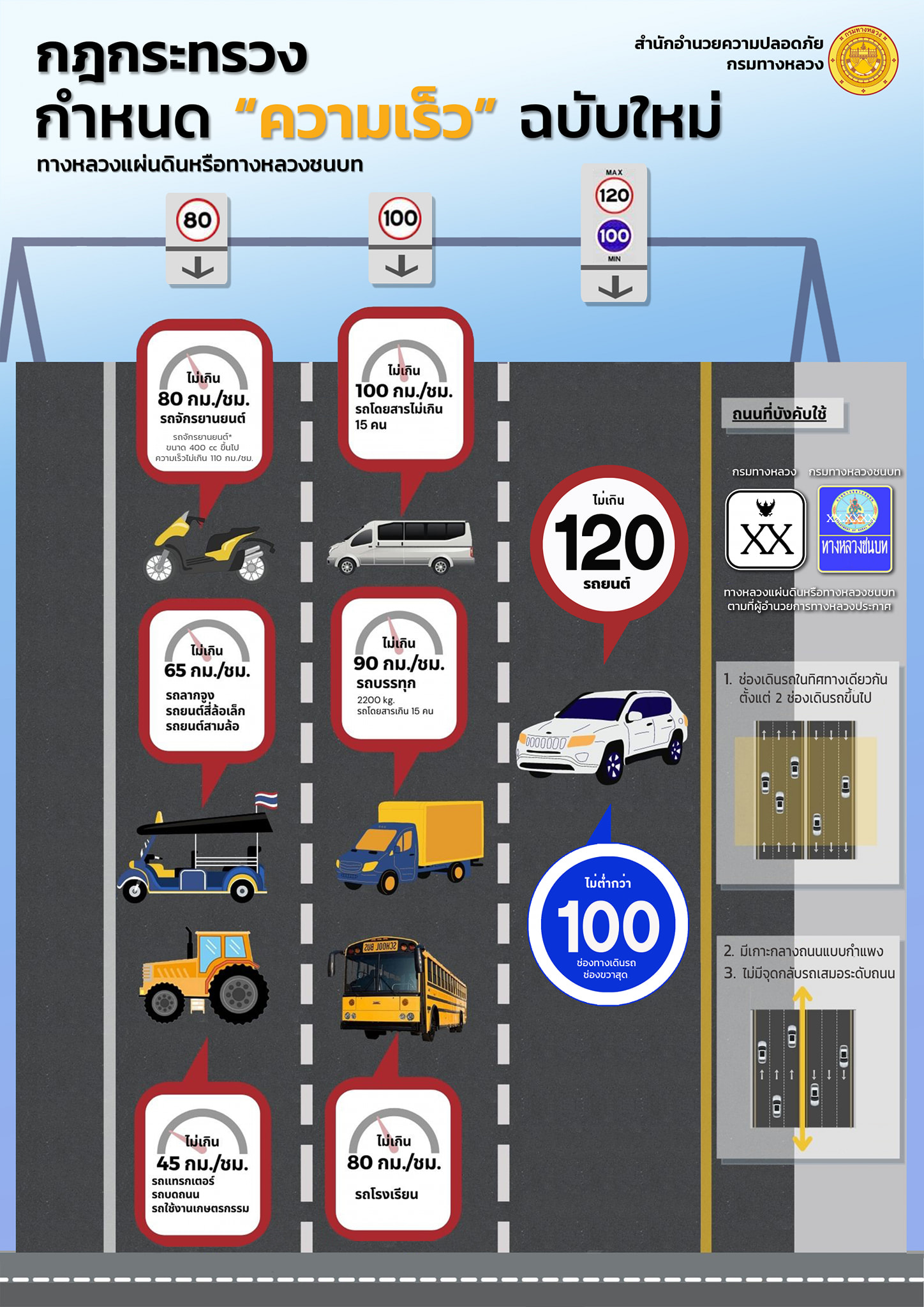 กรมทางหลวง โดยสำนักอำนวยความปลอดภัย ได้จัดทำภาพ infographic เพื่อใช้เผยแพร่ประชาสัมพันธ์เกี่ยวกับเส้นทางตามประกาศผู้อำนวยการทางหลวงแผ่นดินหมายเลข 32 บางปะอิน - พยุหะคีรี (ช่วงอยุธยา - อ่างทอง) ระหว่าง กม. 4+100 ถึง กม.50+000 ทั้งขาเข้าและขาออก เป็นเส้นทางที่ใช้ความเร็วตามกฎกระทรวงฉบับใหม่นี้ได้