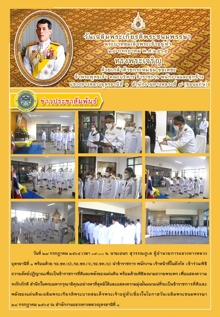 ข้าร่วมพิธีถวายสัตย์ปฏิญาณเพื่อเป็นข้าราชการที่ดีและพลังของแผ่นดิน พร้อมด้วยพิธีลงนามถวายพระพร เพื่อแสดงความจงรักภักดี สำนึกในพระมหากรุณาธิคุณอย่างหาที่สุดมิได้และแสดงความมุ่งมั่นแนวแน่ที่จะเป็นข้าราชการที่ดีและพลังของแผ่นดินเฉลิมพระเกียรติพระบาทสมเด็จพระเจ้าอยู่หัวเนื่องในโอกาสวันเฉลิมพระชนมพรรษา ๒๘ กรกฎาคม ๒๕๖๕