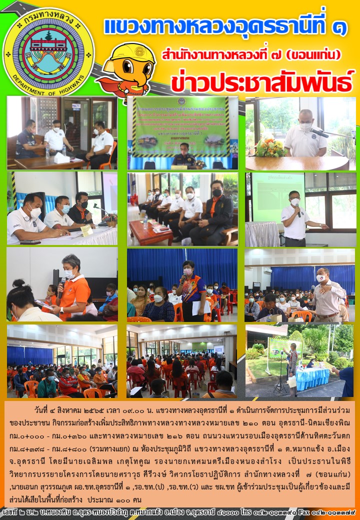 วันที่ 4 สิงหาคม 2565 เวลา 09.00 น. แขวงทางหลวงอุดรธานีที่ 1 ดำเนินการจัดการประชุมการมีส่วนร่วมของประชาชน กิจกรรมก่อสร้างเพิ่มประสิทธิภาพทางหลวงทางหลวงหมายเลข 210 ตอน อุดรธานี-นิคมเชียงพิณ กม.0+000 - กม.0+360 และทางหลวงหมายเลข 216 ตอน ถนนวงแหวนรอบเมืองอุดรธานีด้านทิศตะวันตก กม.8+398 - กม.8+800 (รวมทางแยก) ณ ห้องประชุมภูมิวิถี แขวงทางหลวงอุดรธานีที่ 1 ต.หมากแข้ง อ.เมือง จ.อุดรธานี โดยมีนายเฉลิมพล เกตุโทคูณ รองนายกเทศมนตรีเมืองหนองสำโรง เป็นประธานในพิธี วิทยากรบรรยายโครงการโดยนายศราวุธ คีรีวงษ์ วิศวกรโยธาปฏิบัติการ สำนักทางหลวงที่ 7 (ขอนแก่น) ,นายเอนก สุวรรณภูเต ผอ.ขท.อุดรธานีที่ 1 ,รอ.ขท.(ป) ,รอ.ขท.(ว) และ ชผ.ขท ผู้เข้าร่วมประชุมเป็นผู้เกี่ยวข้องและมีส่วนได้เสียในพื้นที่ก่อสร้าง ประมาณ 100 คน