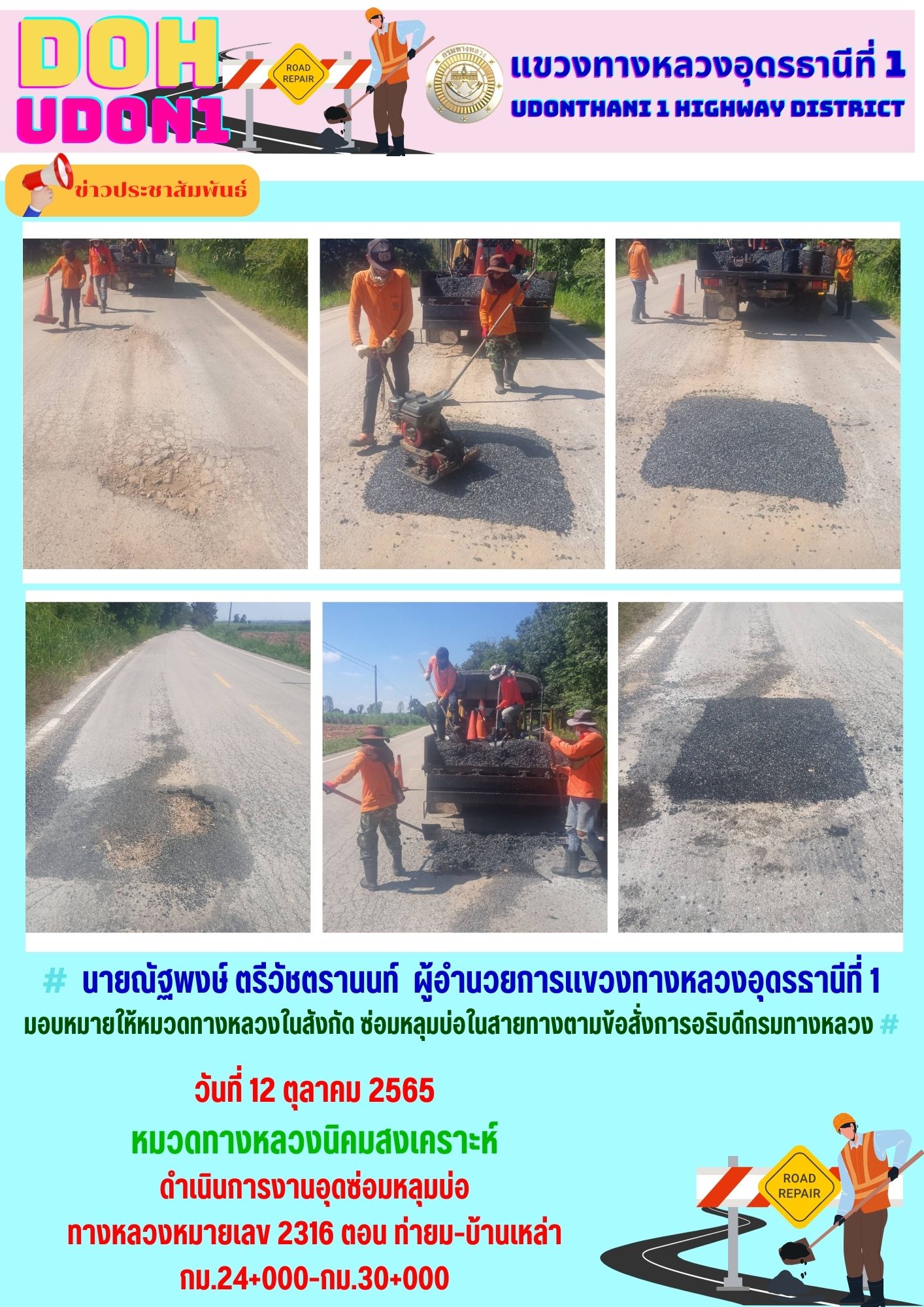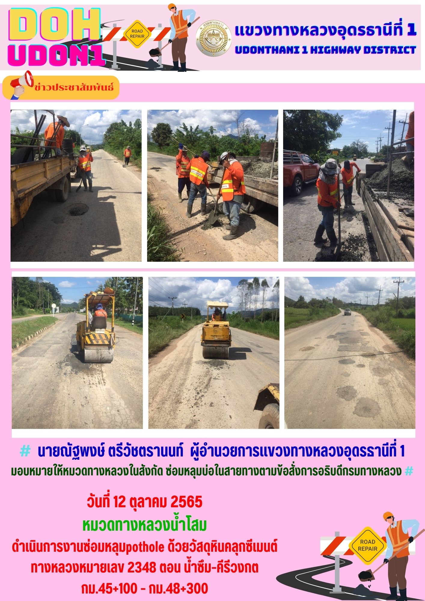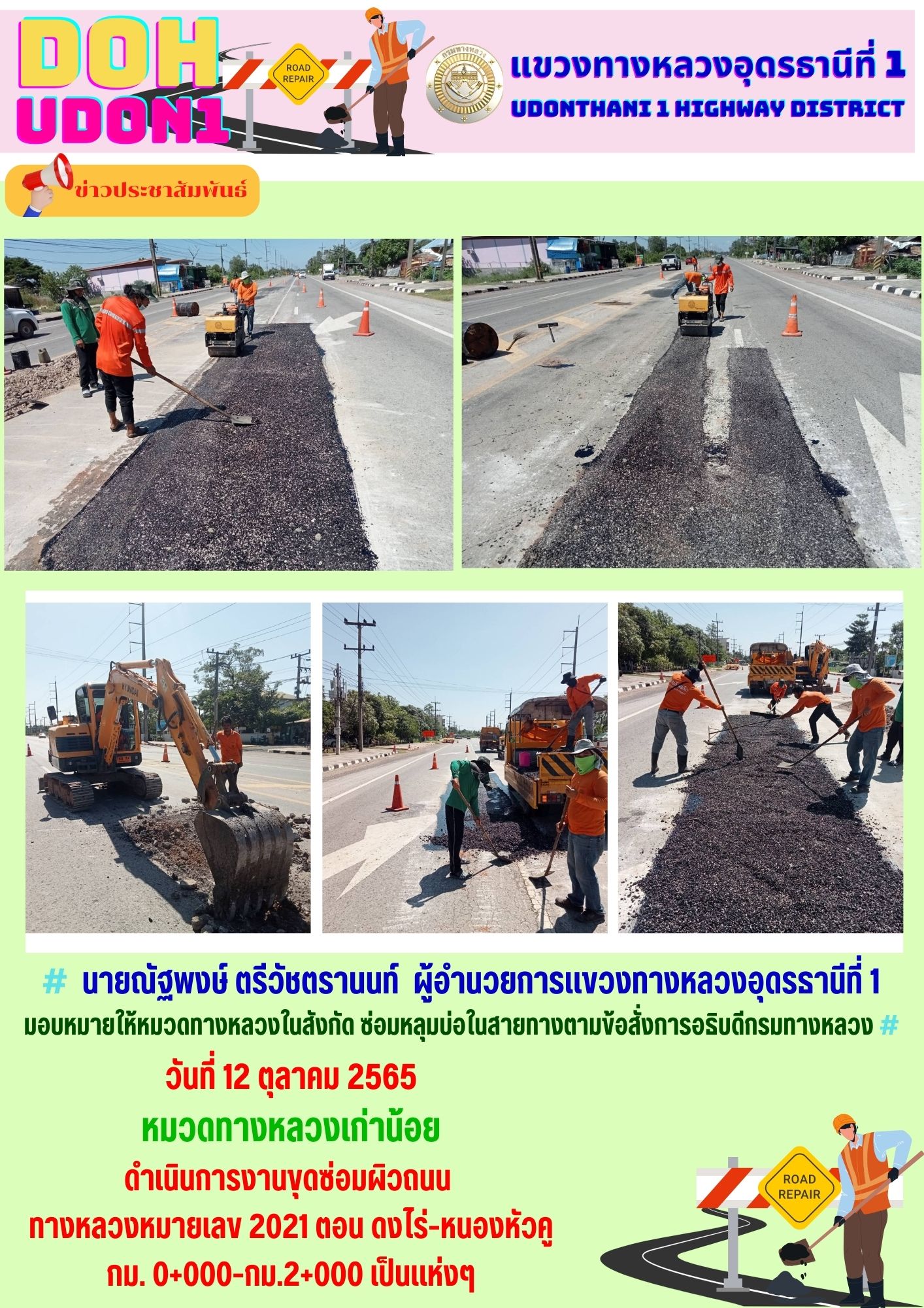 นายณัฐพงษ์ ตรีวัชตรานนท์ ผู้อำนวยการแขวงทางหลวงอุดรธานีที่ 1 มอบหมายให้หมวดทางหลวงในสังกัด ซ่อมหลุมบ่อในสายทางตามข้อสั่งการอธิบดีกรมทางหลวง