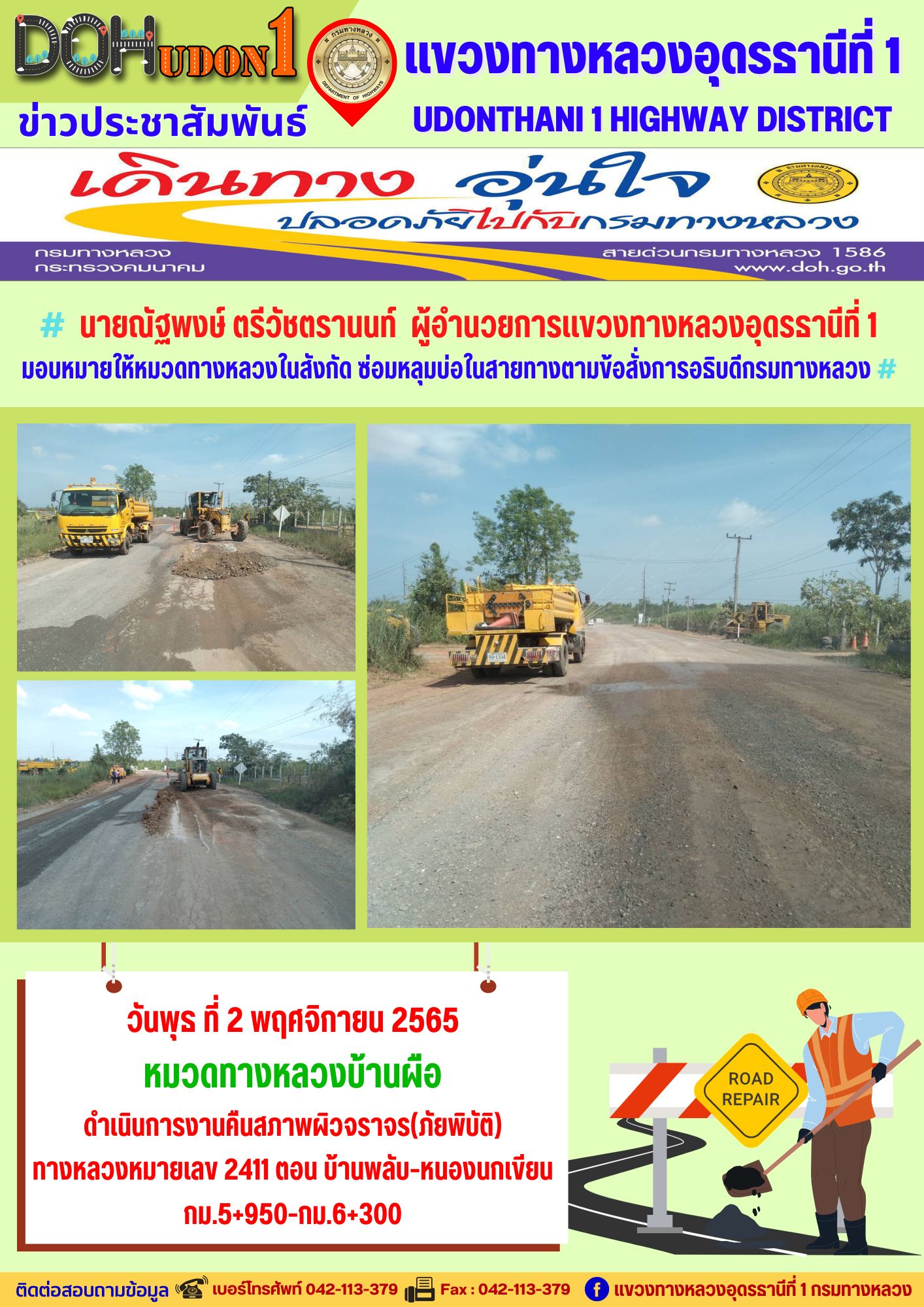 นายณัฐพงษ์ ตรีวัชตรานนท์ ผู้อำนวยการแขวงทางหลวงอุดรธานีที่ 1 มอบหมายให้หมวดทางหลวงในสังกัด ซ่อมหลุมบ่อในสายทางตามข้อสั่งการอธิบดีกรมทางหลวง