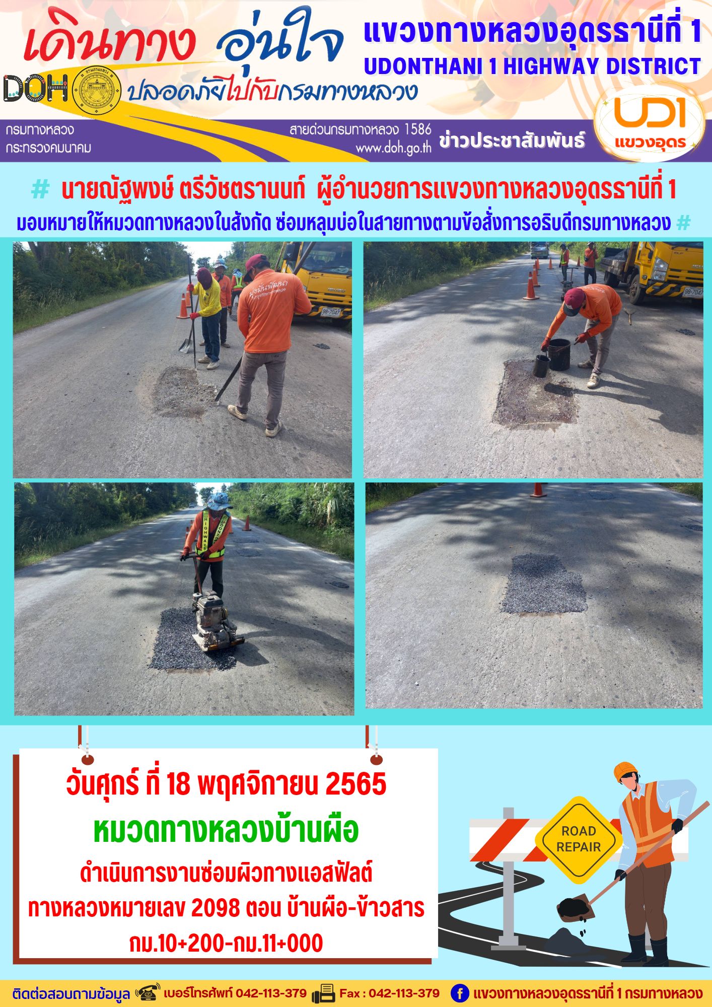 นายณัฐพงษ์ ตรีวัชตรานนท์ ผู้อำนวยการแขวงทางหลวงอุดรธานีที่ 1 มอบหมายให้หมวดทางหลวงในสังกัด ซ่อมหลุมบ่อในสายทางตามข้อสั่งการอธิบดีกรมทางหลวง