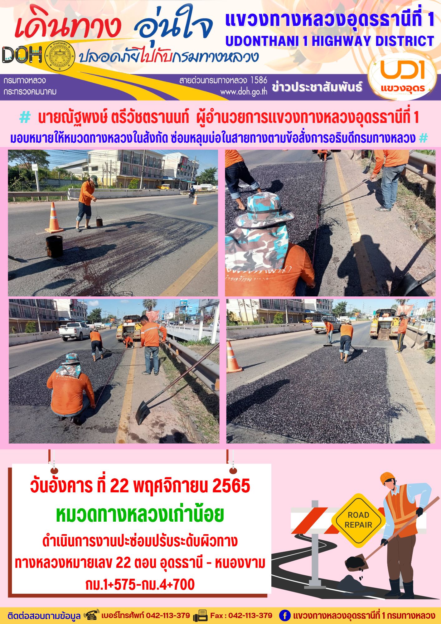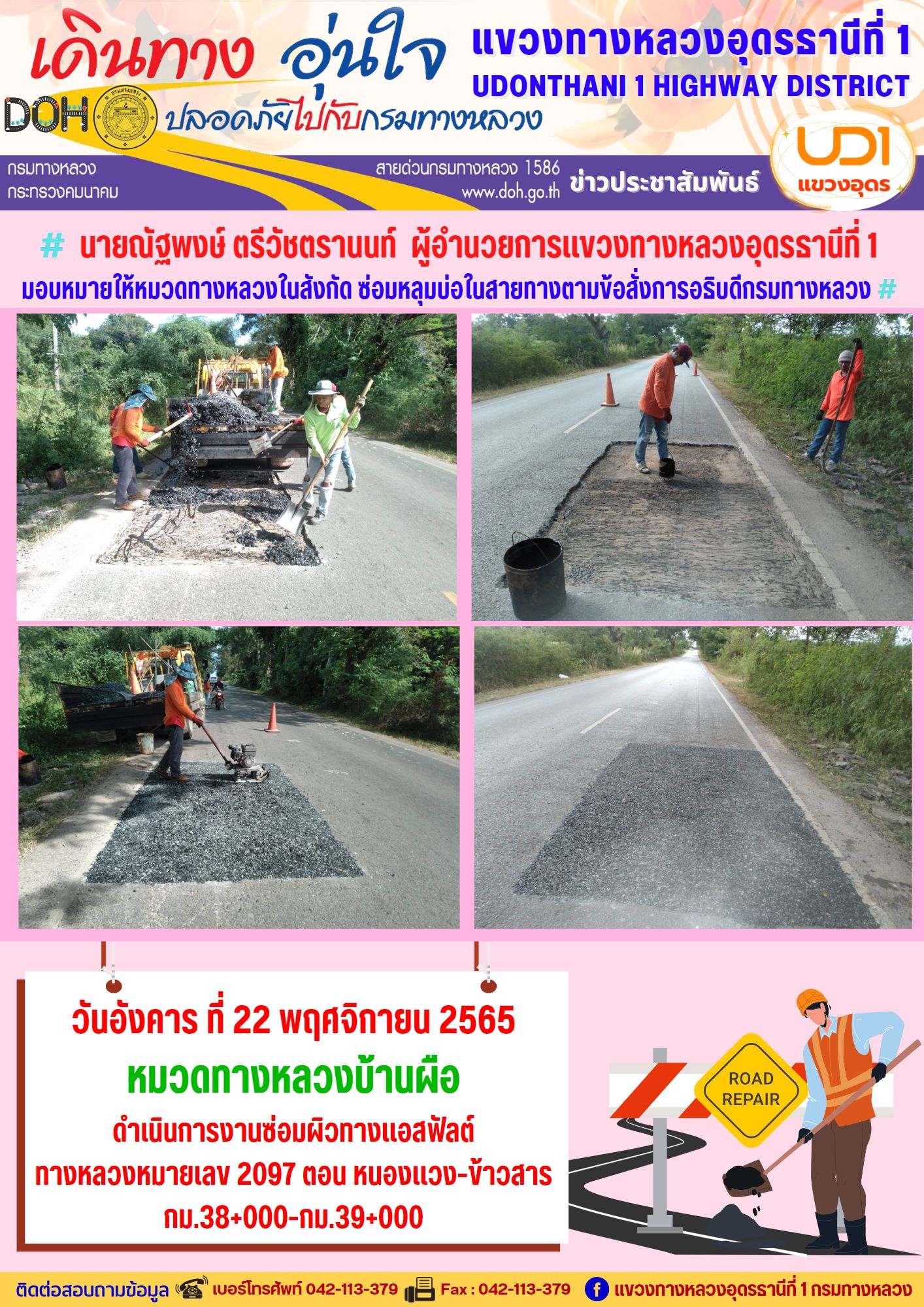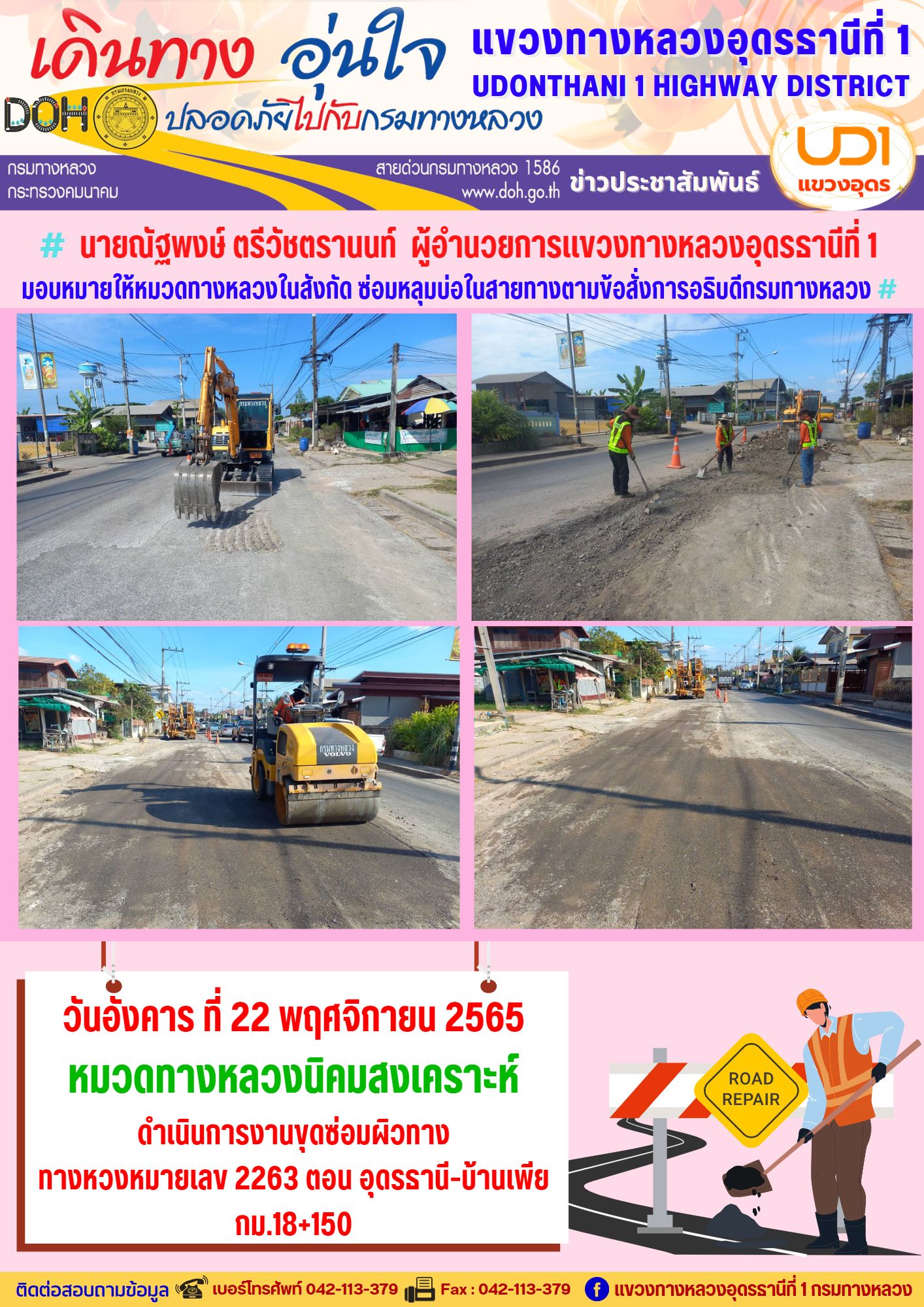 นายณัฐพงษ์ ตรีวัชตรานนท์ ผู้อำนวยการแขวงทางหลวงอุดรธานีที่ 1 มอบหมายให้หมวดทางหลวงในสังกัด ซ่อมหลุมบ่อในสายทางตามข้อสั่งการอธิบดีกรมทางหลวง