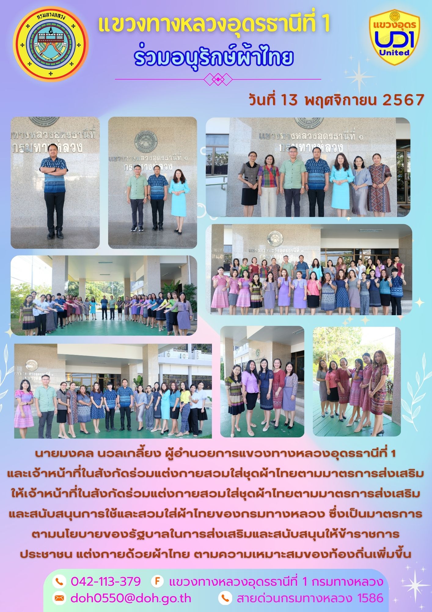 นายมงคล นวลเกลี้ยง ผู้อำนวยการแขวงทางหลวงอุดรธานีที่ 1 และเจ้าหน้าที่ในสังกัดร่วมแต่งกายสวมใส่ชุดผ้าไทยตามมาตรการส่งเสริมให้เจ้าหน้าที่ในสังกัดร่วมแต่งกายสวมใส่ชุดผ้าไทยตามมาตรการส่งเสริมและสนับสนุนการใช้และสวมใส่ผ้าไทยของกรมทางหลวง ซึ่งเป็นมาตรการตามนโยบายของรัฐบาลในการส่งเสริมและสนับสนุนให้ข้าราชการ ประชาชน แต่งกายด้วยผ้าไทย ตามความเหมาะสมของท้องถิ่นเพิ่มขึ้น