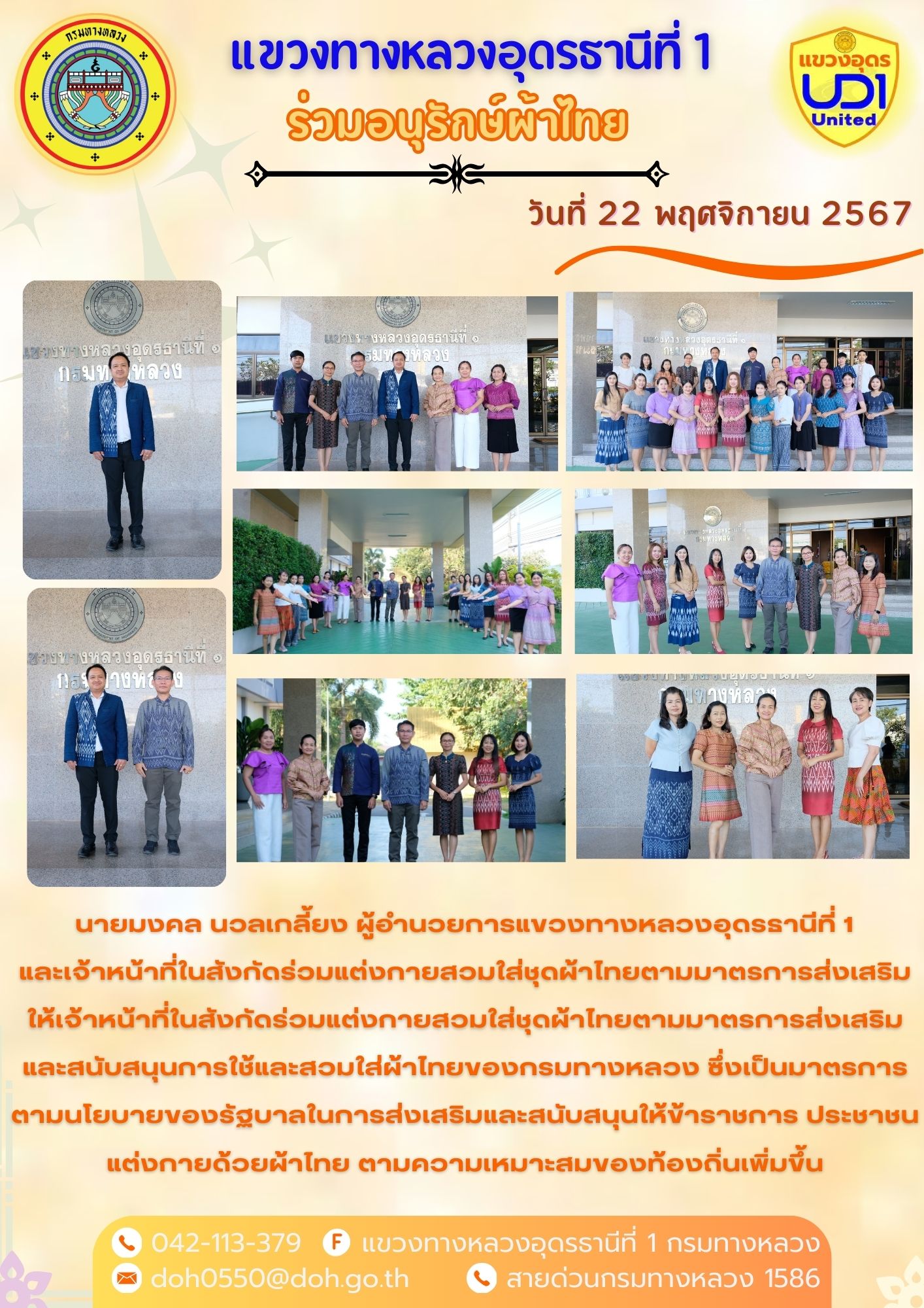 นายมงคล นวลเกลี้ยง ผู้อำนวยการแขวงทางหลวงอุดรธานีที่ 1 และเจ้าหน้าที่ในสังกัดร่วมแต่งกายสวมใส่ชุดผ้าไทยตามมาตรการส่งเสริมให้เจ้าหน้าที่ในสังกัดร่วมแต่งกายสวมใส่ชุดผ้าไทยตามมาตรการส่งเสริมและสนับสนุนการใช้และสวมใส่ผ้าไทยของกรมทางหลวง ซึ่งเป็นมาตรการตามนโยบายของรัฐบาลในการส่งเสริมและสนับสนุนให้ข้าราชการ ประชาชน แต่งกายด้วยผ้าไทย ตามความเหมาะสมของท้องถิ่นเพิ่มขึ้น