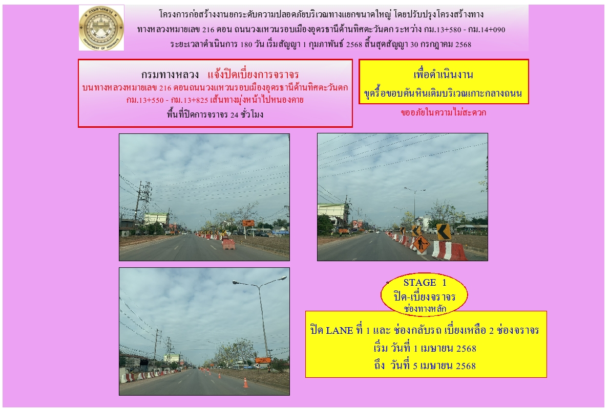 การเบี่ยงการจราจร งานยกระดับความปลอดภัยบริเวณทางแยกขนาดใหญ่ ทางหลวงหมายเลข 216 ตอน ถนนวงแหวนรอบเมืองอุดรธานีด้านทิศตะวันตก ระหว่าง กม.13+580 - กม.14+090