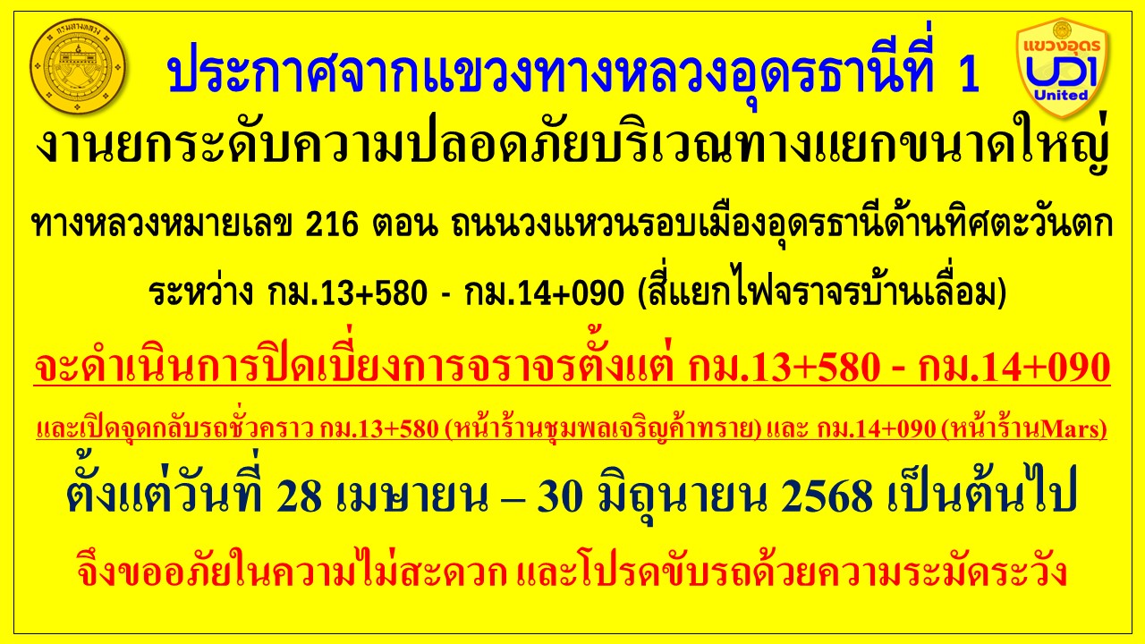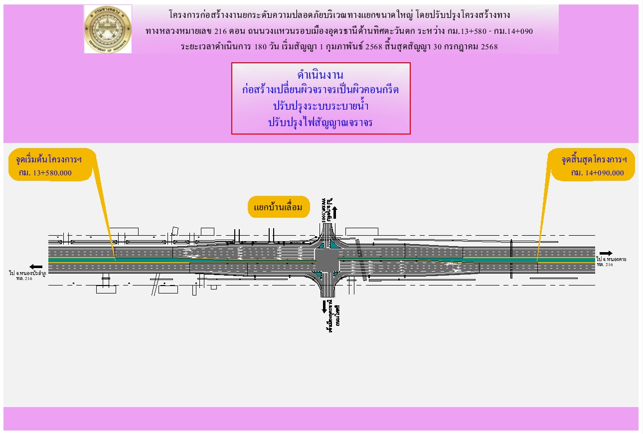ปิดเบี่ยงการจราจร งานยกระดับความปลอดภัยบริเวณทางแยกขนาดใหญ่ ทางหลวงหมายเลข 216 ตอน ถนนวงแหวนรอบเมืองอุดรธานีด้านทิศตะวันตก ระหว่าง กม.13+580 - กม.14+090 (สี่แยกไฟจราจรบ้านเลื่อม)