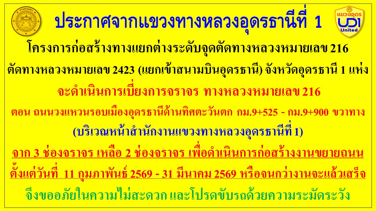 เบี่ยงการจราจร ทางหลวงหมายเลข 216 ตอน ถนนวงแหวนรอบเมืองอุดรธานีด้านทิศตะวันตก กม.9+525 - กม.9+900 ขวาทาง